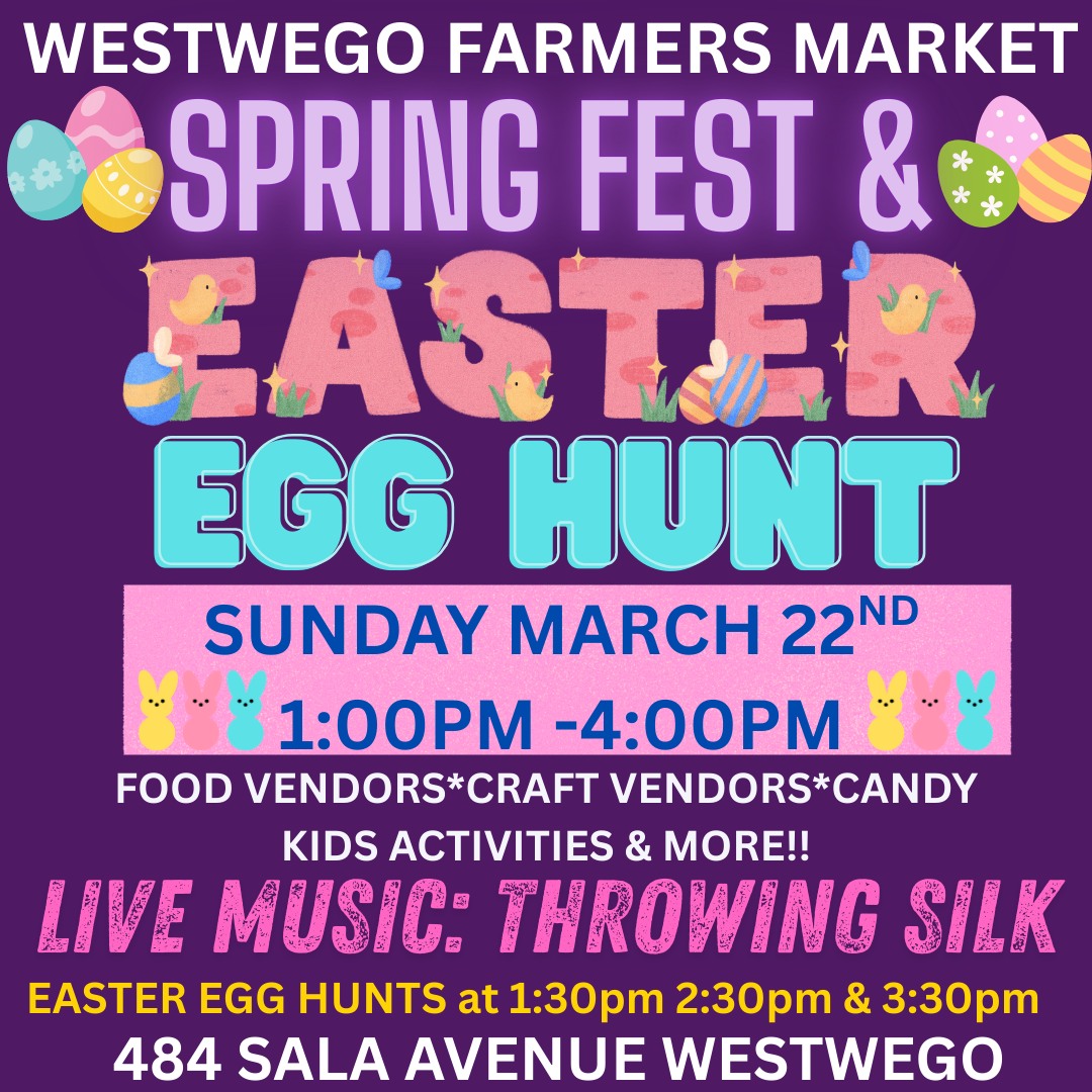 Westwego Farmers Market Spring Fest and Egg Hunt: Sunday, March 22, from 1 – 4 pm. Egg Hunts at 1:30 pm, 2:30 pm, and 3:30 pm. Food and craft vendors, live music, candy, kids’ activities, and more.