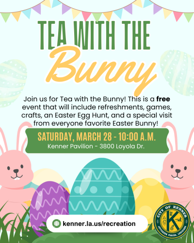 Tea with the Bunny: March 28, at 10 am. Refreshments, games, egg hunt, and Easter Bunny pictures at Kenner Pavilion (3800 Loyola Dr). FREE. Registration required.