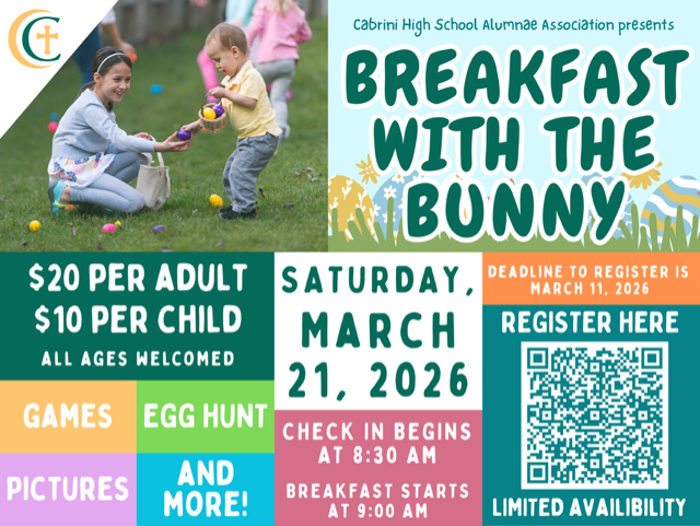 Cabrini Breakfast with the Bunny: March 21 at 9 am: Have breakfast, meet the Easter bunny, enjoy an egg hunt, and more at Cabrini High School. Tickets are $20 for adults and $10 for children.