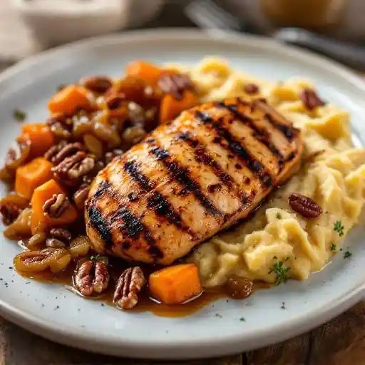 Make the Grilled Chicken & Yams Recipe in just 1h. Grilled chicken breast, mashed sweet potatoes, spiced pecans, caramelized onions, and Worcestershire sauce.
