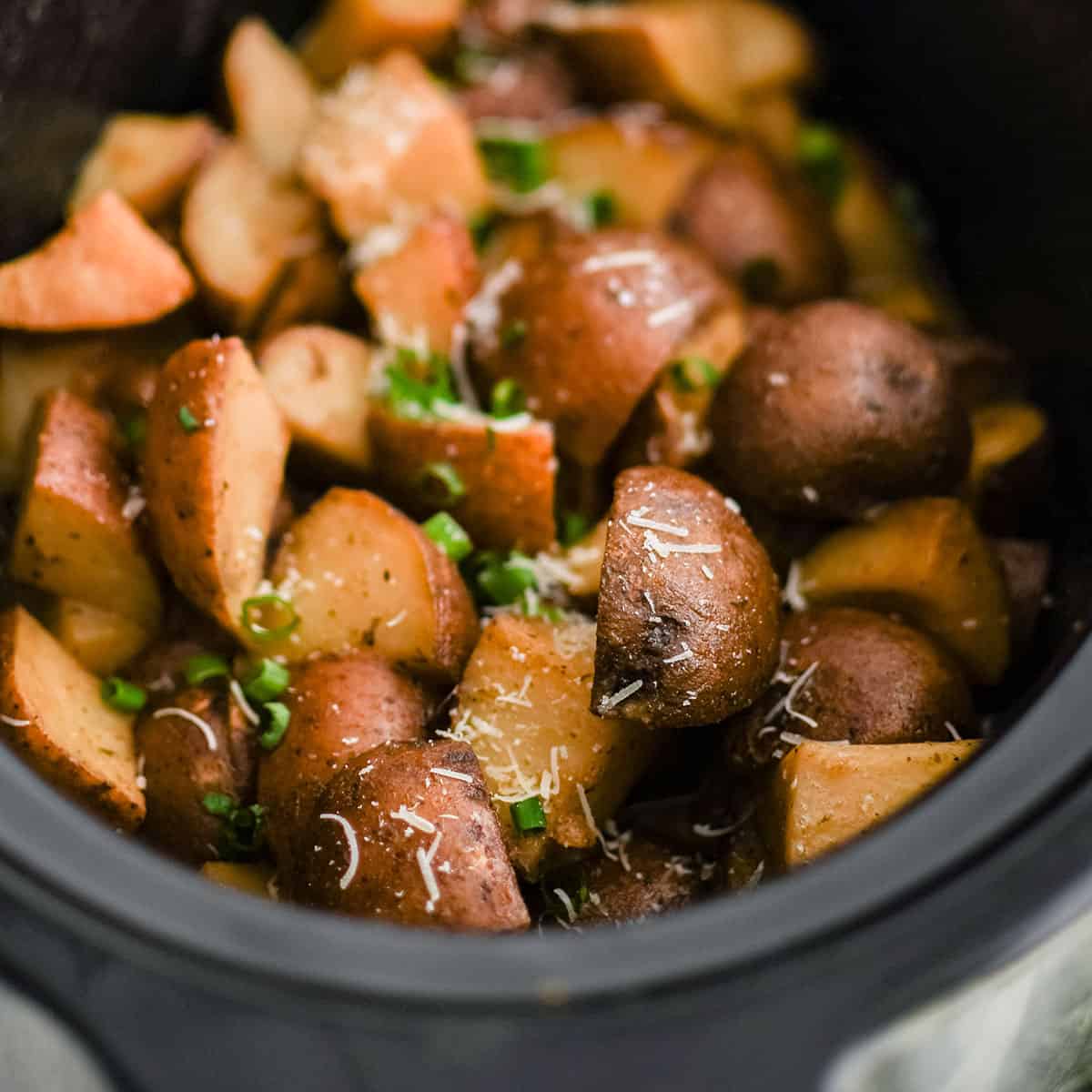A super easy recipe for red potatoes roasted in the crock pot using dry ranch dressing seasoning mix and olive oil.