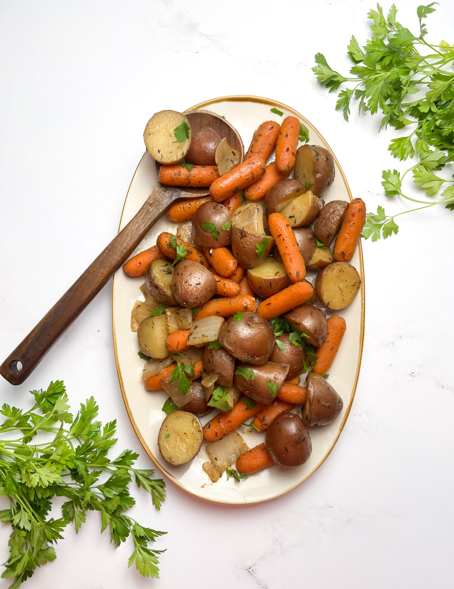 Tender potatoes, sweet carrots, and roasted onions are perfectly seasoned and cooked straight in your slow cooker! Not only is this a delicious side, it also takes just 10 minutes of prep and lets your slow cooker do the hard work.